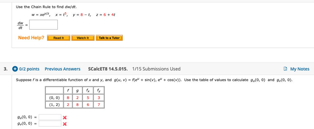 Dw dt w x dx dt w y dy dt w z dz dt and so on. W bartleby menu. But the teachers answer is. W In V x y z2 x 2 sint y 4 cost z 3 tant dw. Du dt u x dx dt u y dy dt 2x2t 2y3cost 4xt 6ycost 4 t2 1 t 63sintcost 4t3 4t 18sintcost 342 Partials of f xy where x and y are functions of two variables s and t. Function Value w x sin y t 0.